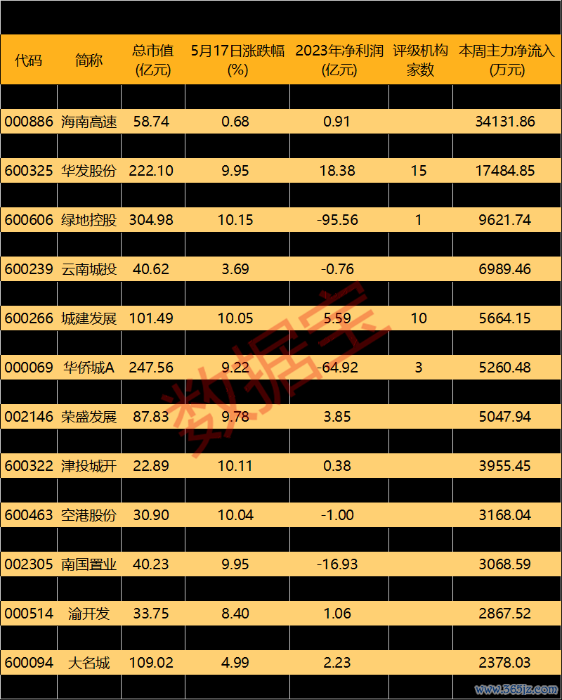 证券时报·数据宝梳理了本周主力资金净流入在2000万元以上的房地产开发股,共计25股。其中,万科A主力资金净流入额居首,高达14.56亿元;海南高速、金地集团、华发股份、城投控股获主力资金净流入过亿元,分别为3.41亿元、2.26亿元、1.75亿元、1.69亿元。