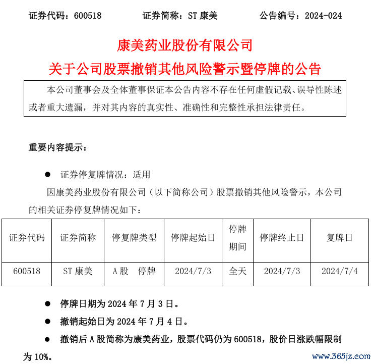 ST康美(600518)7月2日晚间公告,公司股票2024年7月4日起撤销其他风险警示,股票2024年7月3日停牌。撤销后A股简称为康美药业,股价日涨跌幅限制为10%。