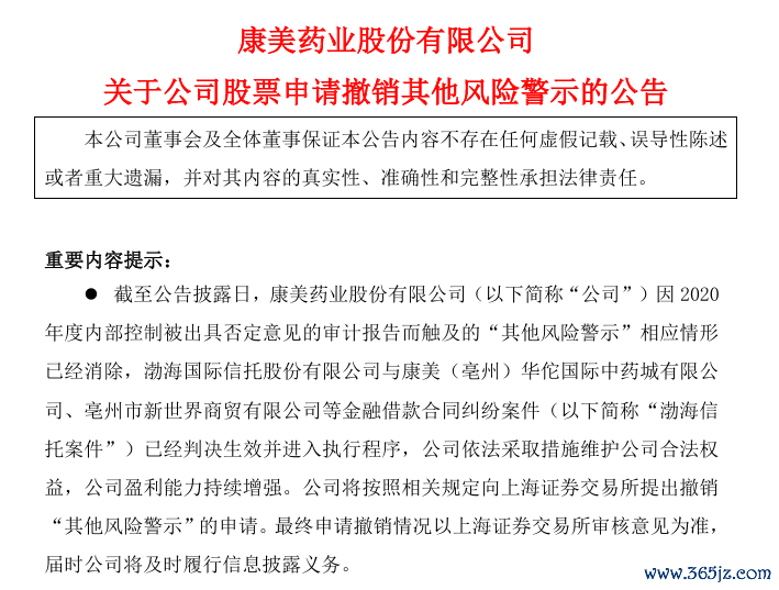 早在2022年,ST康美已经完成了“摘星”,但由于公司2020年年报被审计机构出具了否定意见的内部控制审计报告,2021年年报被审计机构出具了带强调事项段的无保留意见内部控制审计报告,仍存在触发“其他风险警示”的适用情形,因此股票继续被实施其他风险警示(ST)。