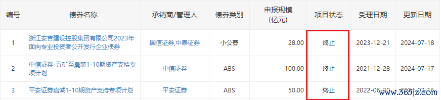 【大河财立方消息】7月18日消息,据深交所披露,深交所近日终止审核3笔债券项目,金额合计178亿元配资天眼网站,品种含小公募、ABS。