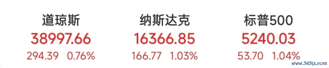当地时间8月6日,在前一交易日大跌后,美股三大指数收高。道指涨294.39点,涨幅为0.76%,报38997.66点;纳指涨166.77点,涨幅为1.03%,报16366.85点;标普500指数涨53.70点,涨幅为1.04%,报5240.03点。
