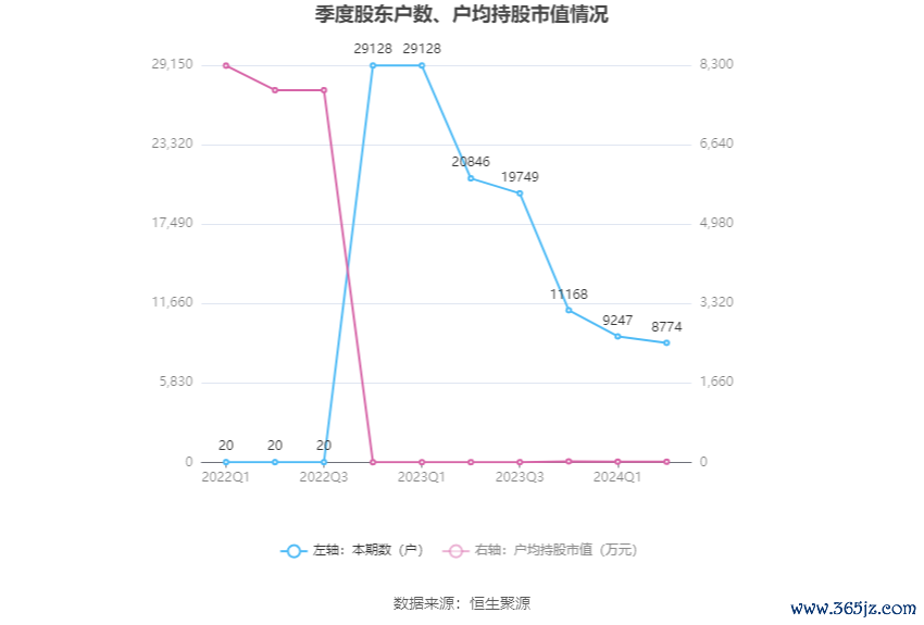 筹码集中度方面,截至2024年上半年末,公司股东总户数为8774户,较一季度末下降了473户,降幅5.12%;户均持股市值由一季度末的14.87万元下降至13.47万元,降幅为9.41%。