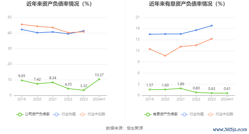 在偿债能力方面,公司2024年上半年末资产负债率为10.37%,相比上年末上升7.05个百分点;有息资产负债率为0.61%,相比上年末下降0.02个百分点。