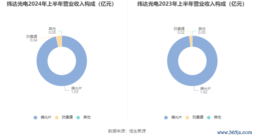 分产品来看,2024年上半年公司主营业务中,偏光片收入1.05亿元,同比增长3.49%,占营业收入的96.28%;防雾膜收入0.04亿元,同比增长128.33%,占营业收入的3.63%。