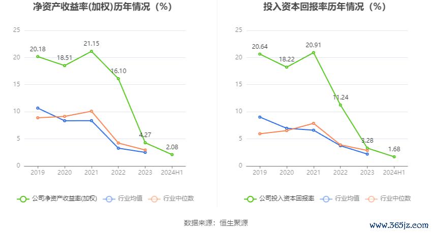 数据显示,2024年上半年公司加权平均净资产收益率为2.08%,较上年同期下降0.80个百分点;公司2024年上半年投入资本回报率为1.68%,较上年同期下降0.58个百分点。