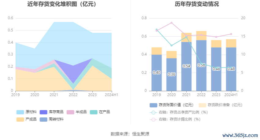 从存货变动来看,截至2024年上半年末,公司存货账面价值为4848.56万元,占净资产的6.49%,较上年末增加69.75万元。其中,存货跌价准备为901.15万元,计提比例为15.67%。