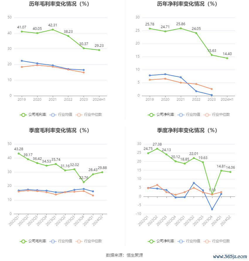 2024年上半年,公司毛利率为29.23%,同比下降3.98个百分点;净利率为14.40%,较上年同期下降6.20个百分点。从单季度指标来看,2024年第二季度公司毛利率为29.88%,同比下降1.28个百分点,环比上升1.45个百分点;净利率为14.06%,较上年同期下降7.95个百分点,较上一季度下降0.75个百分点。