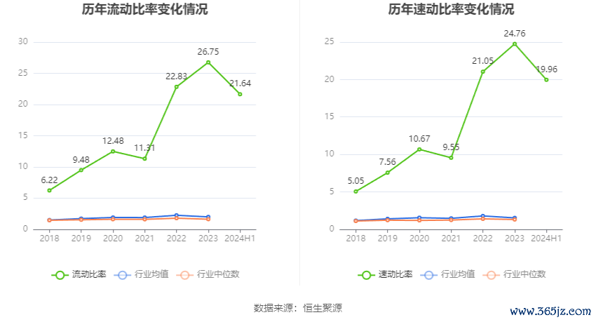 2024年上半年,公司流动比率为21.64,速动比率为19.96。