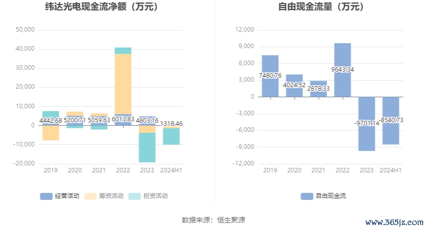 2024年上半年,公司经营活动现金流净额为1318.46万元,同比下降37.18%;筹资活动现金流净额-1431.49万元,同比增加1046.44万元;投资活动现金流净额-8560.38万元,上年同期为-1.18亿元。