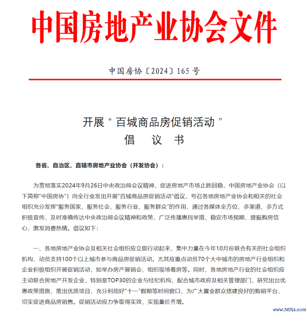 中国房协在倡议中提出,各地房地产行业组织应主动联合房地产开发企业,特别是TOP30的企业与经纪机构,配合城市政府及相关管理部门,研究出台优惠措施,推出优质项目,充分利用好“十一”假期等时间窗口,为广大置业群众搭建良好的购销平台,切实促进商品房销售。促销活动应力争取得实效,实现量价齐增。