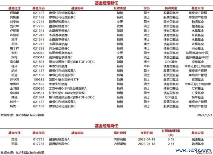 南方财经6月21日电,据东方财富Choice数据统计,今日新聘基金经理14人股票杠杆配资平台,涉及14只基金(A/C类分开计算)股票杠杆配资平台,主要来自摩根资产管理、永赢基金等公司。另外,今日有1位基金经理离任。