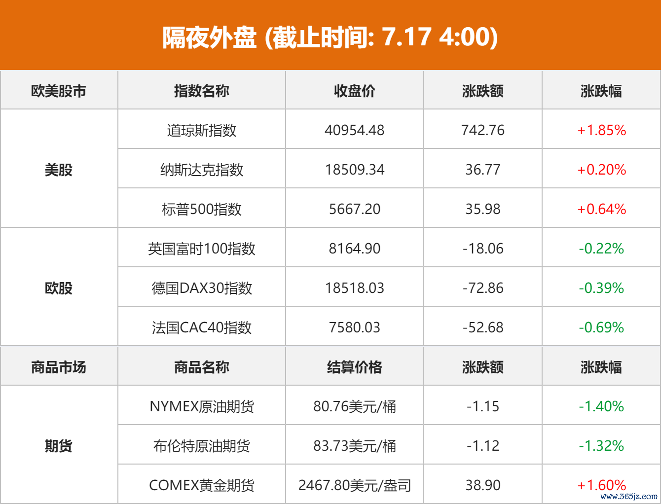 美股:道琼斯工业平均指数比前一交易日上涨742.76点,收于40954.48点,涨幅为1.85%;标准普尔500种股票指数上涨35.98点,收于5667.20点,涨幅为0.64%;纳斯达克综合指数上涨36.77点,收于18509.34点,涨幅为0.20%。