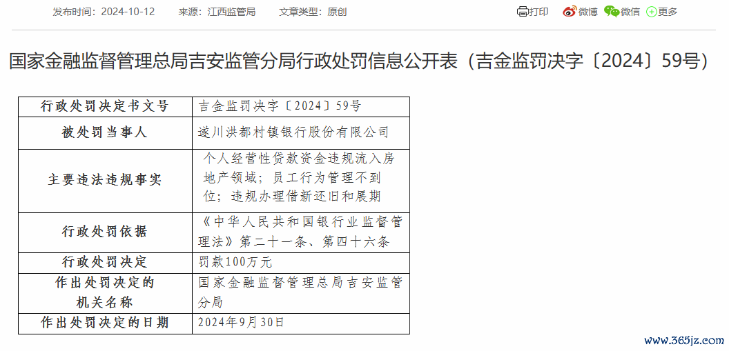 中国网财经10月14日讯日前十大配资平台app下载,国家金融监督管理总局吉安监管分局行政处罚信息公开表显示,遂川洪都村镇银行因个人经营性贷款资金违规流入房地产领域;员工行为管理不到位;违规办理借新还旧和展期,被罚款100万元。上述处罚决定作出的日期为2024年9月30日。