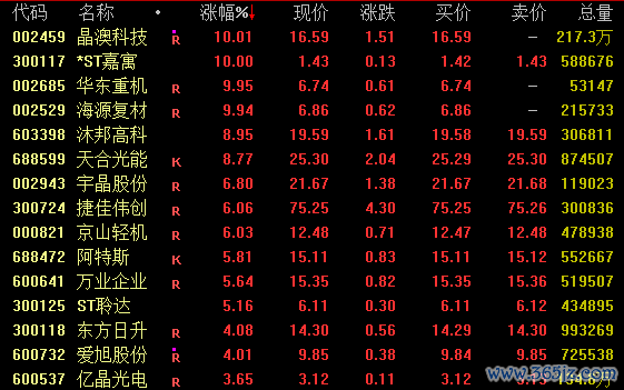 光伏产业链股强势拉升,截至收盘,晶澳科技、海源复材涨停,沐邦高科、天合光能涨近9%,隆基绿能涨约5%,通威股份涨约3%。