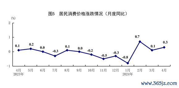 4月份,全国居民消费价格(CPI)同比上涨0.3%,涨幅比上月扩大0.2个百分点;环比上涨0.1%,上月为下降1.0%。分类别看,食品烟酒价格同比下降1.4%,衣着价格上涨1.6%,居住价格上涨0.2%,生活用品及服务价格上涨1.4%,交通通信价格上涨0.1%,教育文化娱乐价格上涨1.8%,医疗保健价格上涨1.6%,其他用品及服务价格上涨3.8%。在食品烟酒价格中,鲜果价格下降9.7%,粮食价格上涨0.5%,鲜菜价格上涨1.3%,猪肉价格上涨1.4%。扣除食品和能源价格后的核心CPI同比上涨0.7%,涨幅比上月扩大0.1个百分点。1-4月份,全国居民消费价格同比上涨0.1%。
