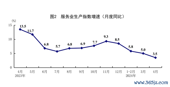 4月份,全国服务业生产指数同比增长3.5%。分行业看,信息传输、软件和信息技术服务业,租赁和商务服务业,金融业,交通运输、仓储和邮政业生产指数同比分别增长10.8%、6.1%、5.4%、4.3%,分别快于服务业生产指数7.3、2.6、1.9、0.8个百分点。1-4月份,全国服务业生产指数同比增长5.0%。1-3月份,规模以上服务业企业营业收入同比增长8.5%。4月份,服务业商务活动指数为50.3%;服务业业务活动预期指数为57.4%。其中,铁路运输、道路运输、邮政、电信广播电视及卫星传输服务等行业商务活动指数位于55.0%以上较高景气区间。