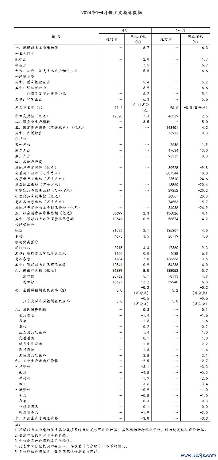 总的来看,4月份国民经济运行平稳,虽然部分指标受节假日错月、上年同期基数较高等因素影响增速有所放缓,但工业、出口、就业、物价等主要指标总体改善,新动能保持较快成长,国民经济延续回升向好态势,积极因素累积增多。但也要看到,外部环境复杂性、严峻性、不确定性明显上升,经济持续回升向好仍面临诸多困难挑战。下阶段,要坚持以习近平新时代中国特色社会主义思想为指导,全面贯彻落实中央政治局会议精神,坚持稳中求进工作总基调,完整、准确、全面贯彻新发展理念,加快构建新发展格局,着力推动高质量发展,靠前发力有效落实已经确定的宏观政策,巩固和增强经济回升向好态势,持续推动经济实现质的有效提升和量的合理增长。