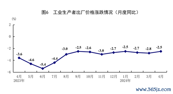 4月份,全国工业生产者出厂价格同比下降2.5%,降幅比上月收窄0.3个百分点;环比下降0.2%。全国工业生产者购进价格同比下降3.0%,环比下降0.3%。1-4月份,全国工业生产者出厂价格和购进价格同比分别下降2.7%和3.3%。