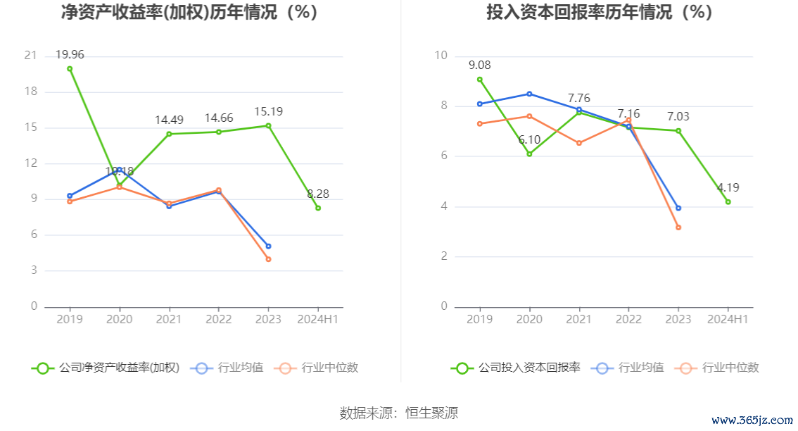数据显示,2024年上半年公司加权平均净资产收益率为8.28%,较上年同期下降0.65个百分点;公司2024年上半年投入资本回报率为4.19%,较上年同期下降0.41个百分点。