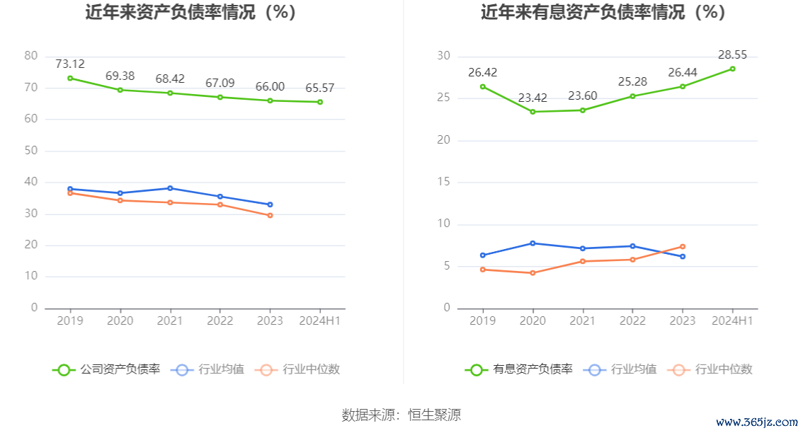 在偿债能力方面,公司2024年上半年末资产负债率为65.57%,相比上年末下降0.43个百分点;有息资产负债率为28.55%,相比上年末上升2.11个百分点。
