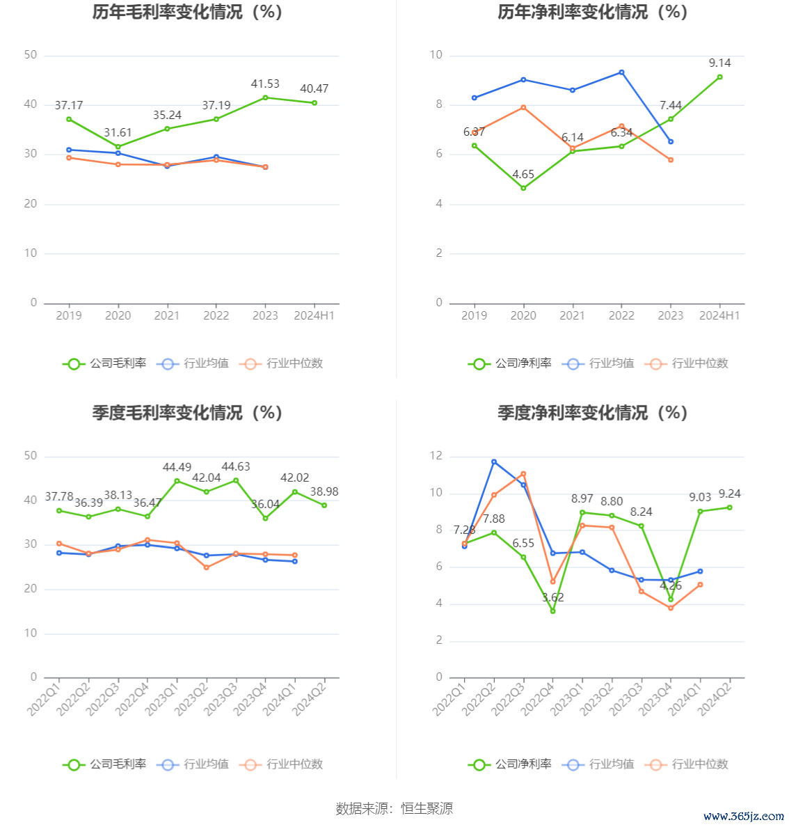 2024年上半年,公司毛利率为40.47%,同比下降2.75个百分点;净利率为9.14%,较上年同期上升0.26个百分点。从单季度指标来看,2024年第二季度公司毛利率为38.98%,同比下降3.06个百分点,环比下降3.04个百分点;净利率为9.24%,较上年同期上升0.44个百分点,较上一季度上升0.21个百分点。