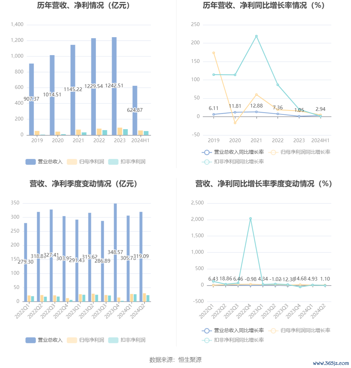 根据半年报,公司第二季度实现营业总收入319.09亿元,同比增长1.10%,环比增长4.35%;归母净利润29.91亿元,同比增长5.71%,环比增长9.14%;扣非净利润23.14亿元,同比下降5.72%,环比下降12.64%。
