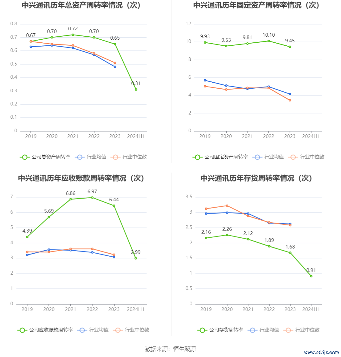 营运能力方面,2024年上半年,公司公司总资产周转率为0.31次,上年同期为0.33次(2023年上半年行业平均值为0.22次,公司位居同行业7/37);公司应收账款周转率、存货周转率分别为2.99次、0.91次。