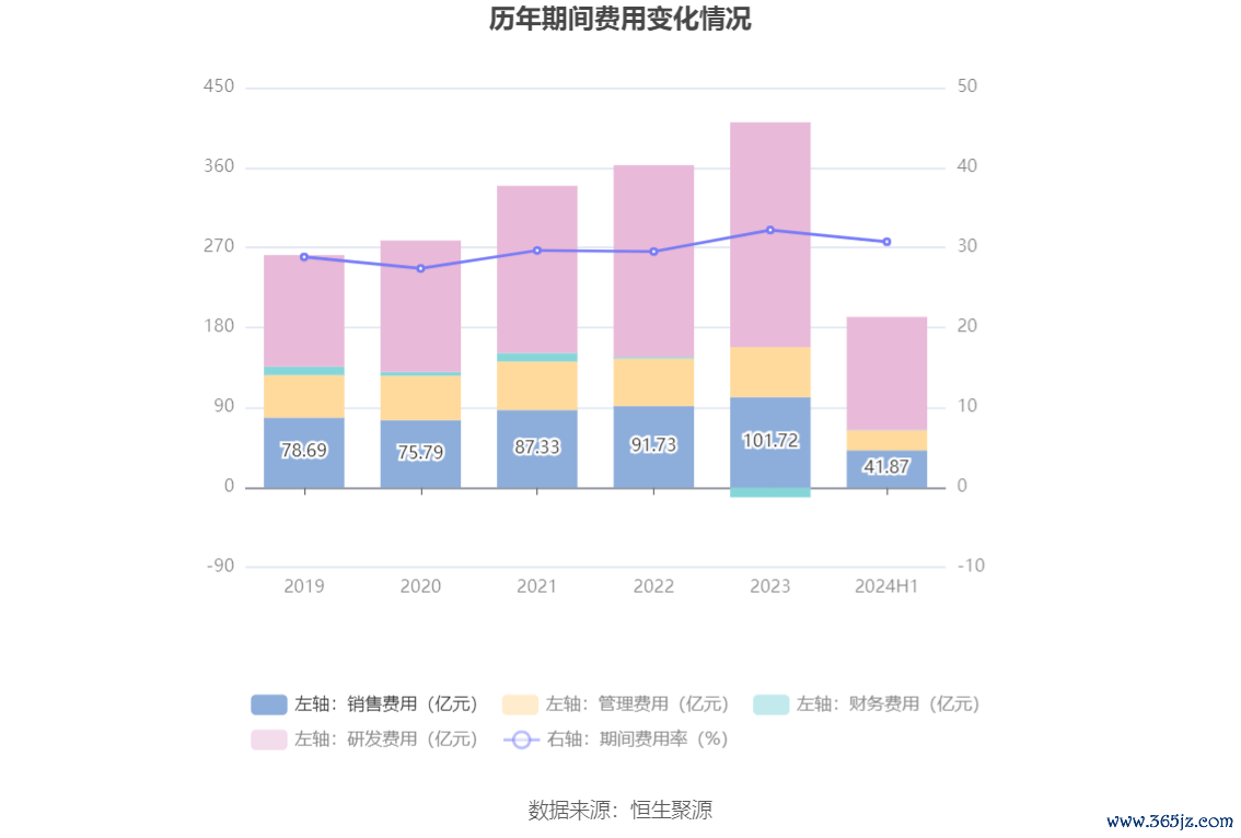 2024年上半年,公司期间费用为191.96亿元,较上年同期增加8674.20万元;但期间费用率为30.72%,较上年同期下降0.76个百分点。其中,销售费用同比下降9.29%,管理费用同比下降11.09%,研发费用同比下降0.51%,财务费用由去年同期的-8.14亿元变为4630.50万元。